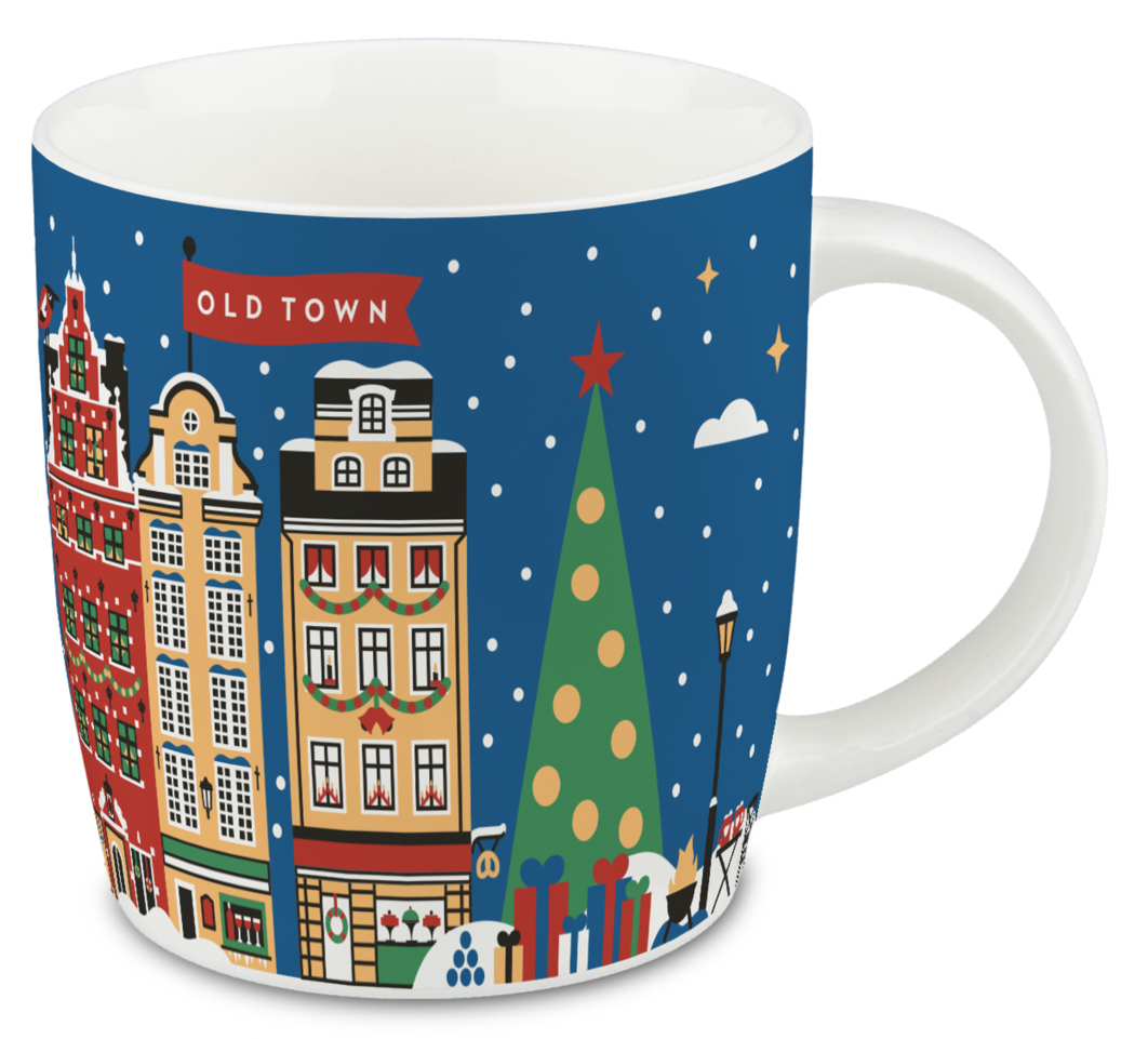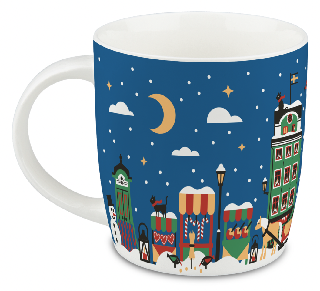 En vacker mugg i porslin mugg tillverkad i Tyskland. Muggen har ett fint mönster med ett klassiskt Gamla stan mönster. Här finner ni julmarknaden och julgranen på Stortorget. En fin mugg att ge bort i present eller till köket. Passar som glöggmugg eller kaffe kopp eller som fin svensk souvenir. Vi har flera fina produkter med söta hus på !